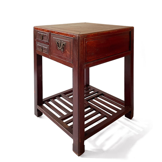 Ein Teetisch / Mahjongtisch mit zwei Holzstühlen in schwarzer Farbe.
