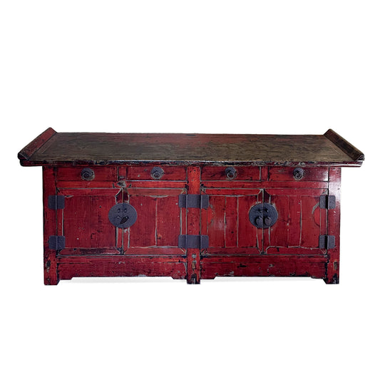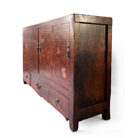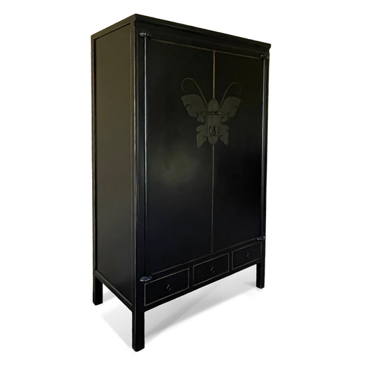 Schwarzer Holzschrank mit vier Beinen und Schmetterlingsmotiv